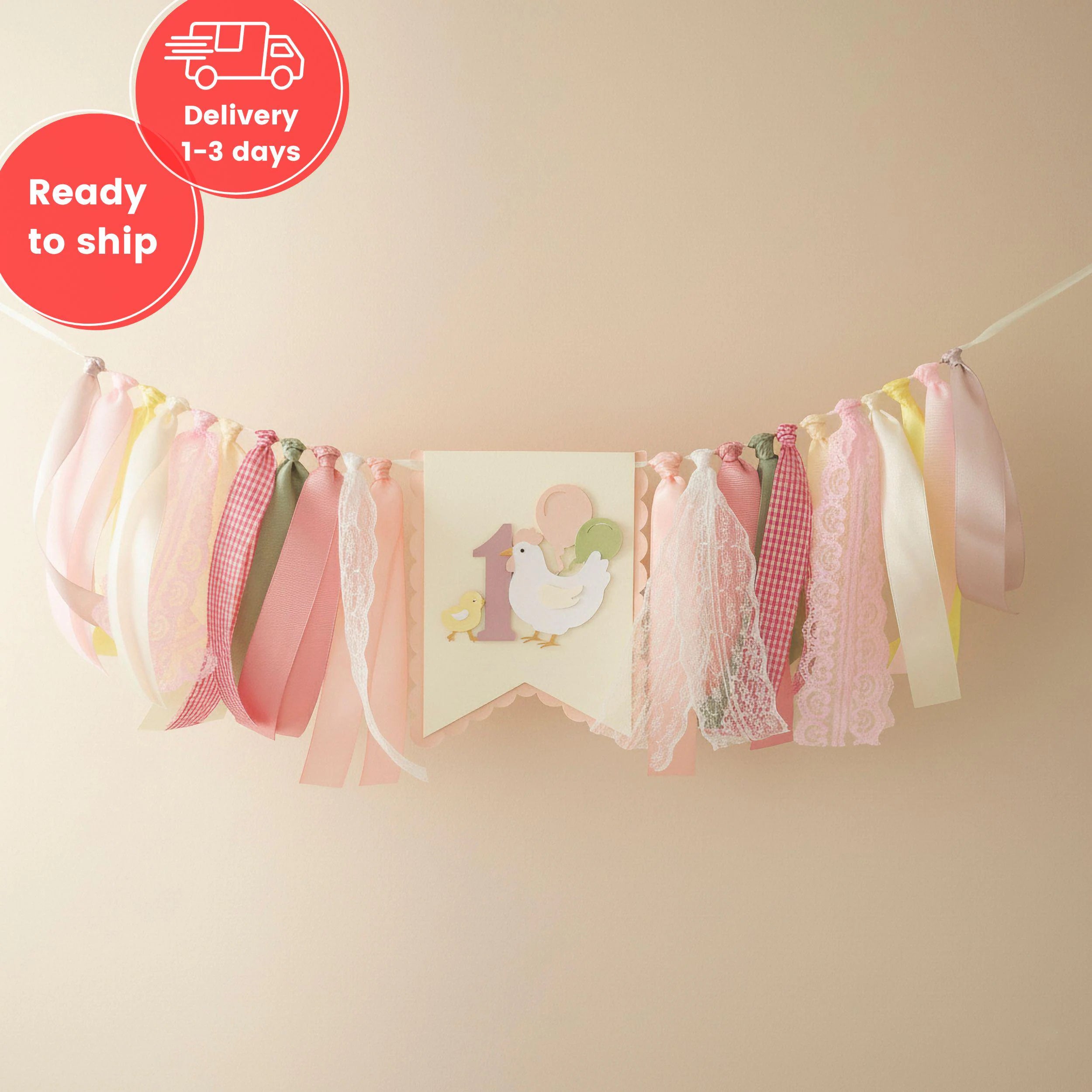 - Highchair Banners: The star of the show! Our "This Chick is One" highchair banners feature rag-tie garlands and high-quality cardstock or white pennants.