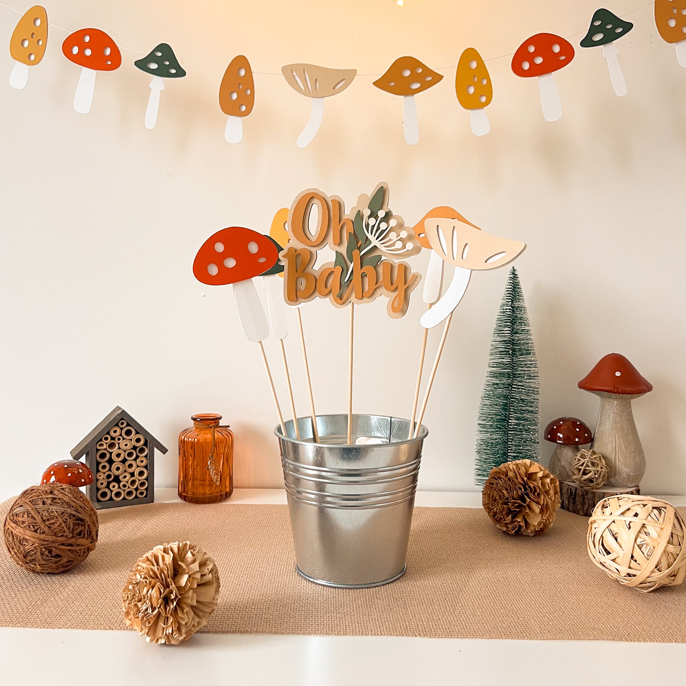 Welcome your newest little sprout with these whimsical Mushroom Centerpieces, perfect for an Enchanted Forest, a Little Fungi or Cottagecore Baby Shower.