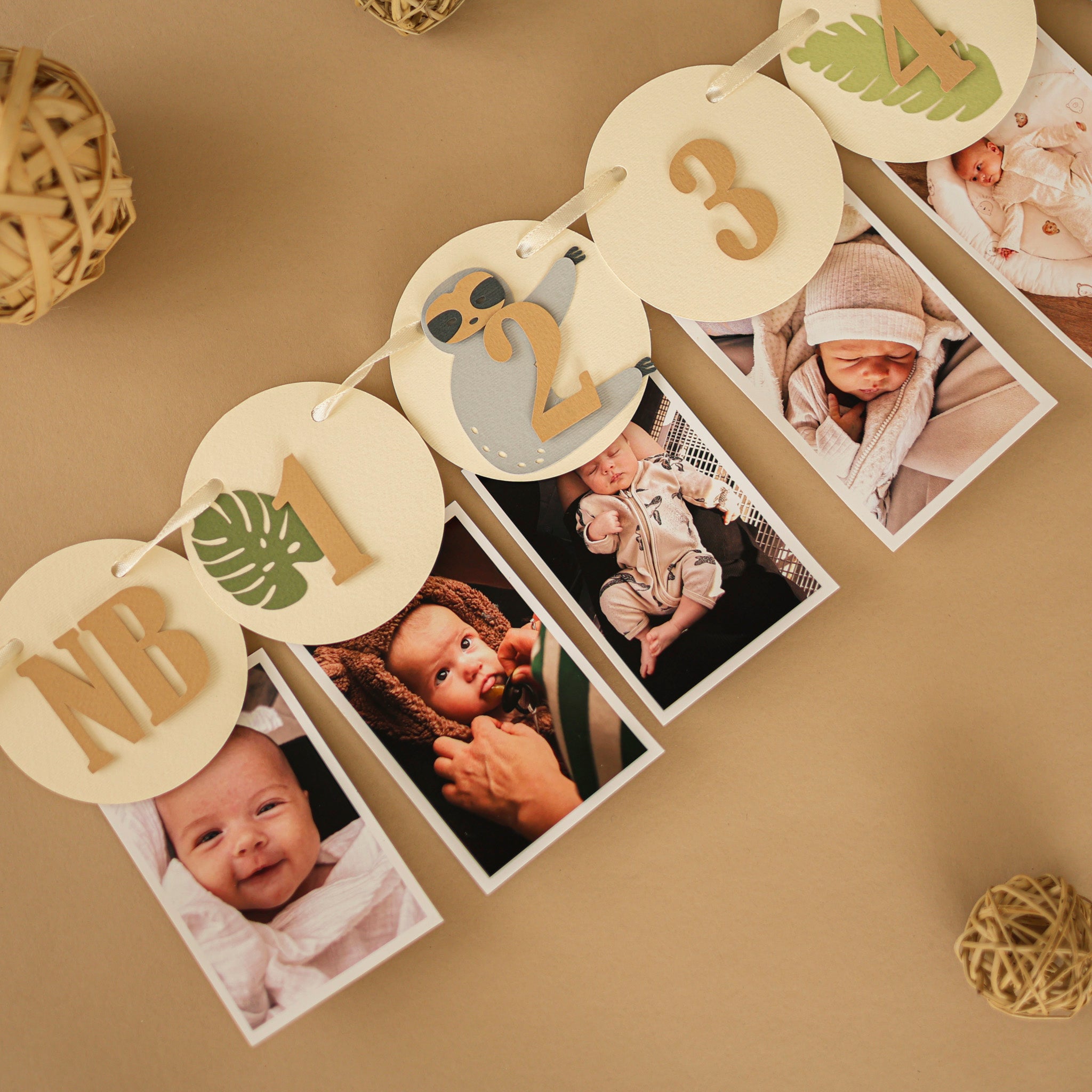 • 12 Month Banner ⇒ consists of 13 shapes (newborn through 12 months). Each shape is backed with a wood pin to clips on the back to hold Baby photos